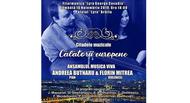 Sambata, 16 noiembrie, la ora 18:00, la Palatul ”Lyra” Braila va avea loc o serata muzicala sub genericul “Calatorii europene”. Ansamblul Musica Viva, alcatuit din pianista Andreea Butnaru si violoncelistul Florin Mitrea, va oferi spectatorilor un periplu muzical prin Franta, Rusia, Ungaria, Germania, Austria si Romania.