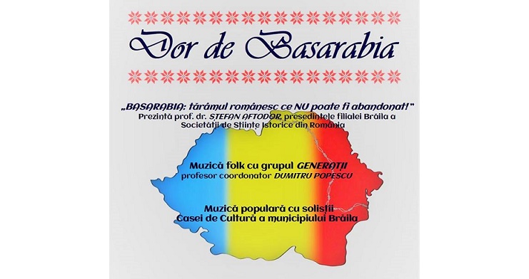 Miercuri, 27 martie, incepand cu ora 17:30, la Casa Memoriala “Petre Stefanescu-Goanga” (Piata Poligon nr. 2) va avea loc manifestarea cultural-artistica “Dor de Basarabia”. Evenimentul este organizat de Casa de Cultura a Municipiului Braila, in colaborare cu Asociatia “ProBasarabia si Bucovina” – filiala “Vasile Voloc” Braila si Societatea de Stiinte Istorice din Romania, cu ocazia implinirii a 101 de ani de la Unirea Basarabiei cu Romania.