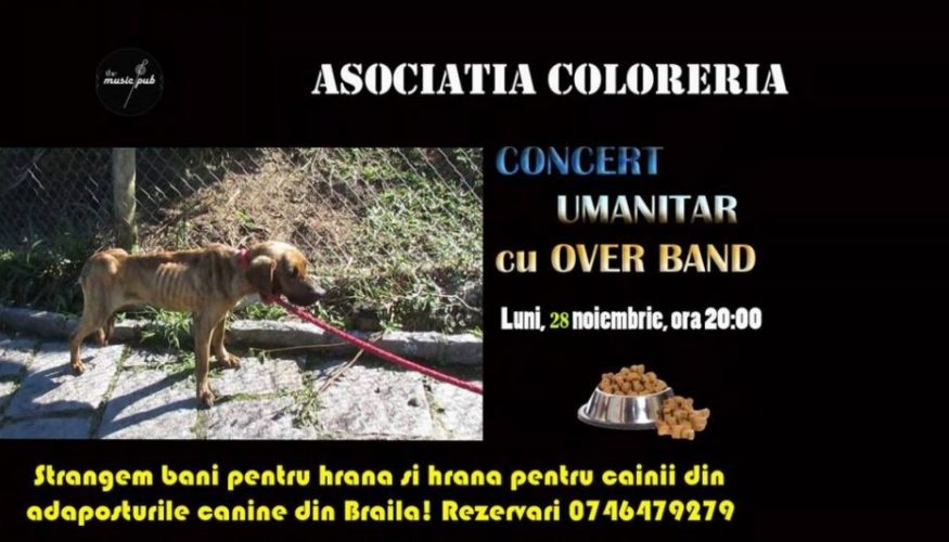 Asociatia COLORERIA organizeaza in aceasta luna, in premiera pentru Braila, un concert avand ca scop strangerea de fonduri pentru sustinerea adaposturilor de caini cu hrana pentru animale. Concertul va fi sustinut de trupa OVER BAND, care interpreteaza si reinterpreteaza marile piese muzicale rock si pop-rock, iar evenimentul va avea loc la The Music Pub, in data de 28 noiembrie, de la ora 20:00.