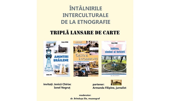 Vineri, 7 februarie, la ora 16:00, la Sectia Etnografie a Muzeului Brailei „Carol I” (strada Polona, nr. 14) va avea loc o tripla lansare de carte: „Amintiri brailene” (2013), „Destine involburate” (2019) si „Iubirea, simbol al fericirii” (2019), semnate de Petre Stroe. Volumele au aparut la Editura „Lucas” din Braila.
