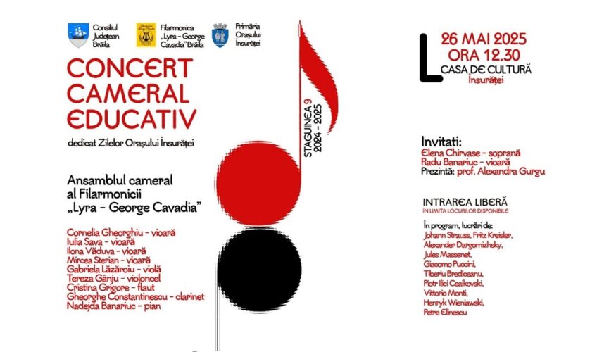 Astăzi, 26 mai, de la ora 12.30, la Casa de Cultură din orașul Însurăței va avea loc un Concert cameral educativ susținut de Ansamblul cameral al Filarmonicii „Lyra – George Cavadia” Brăila.