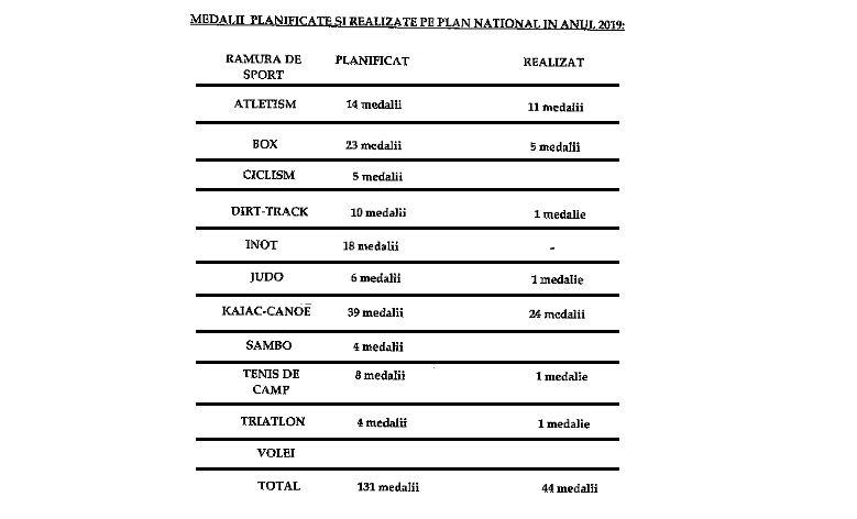 In documentul amintit se mai precizeaza si faptul ca faptul ca sefii CSM Braila si-au planificat sa obtina in acest an 131 de medalii. Pana la finele lunii august, dupa cum am precizat, sportivii clubului au obtinut la Campionatele Nationale si Cupa Romaniei doar 44 de medalii (vezi foto).
