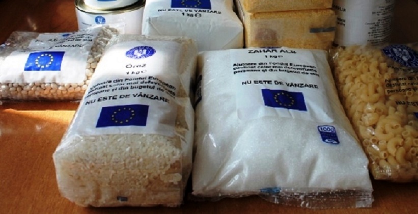 Pachetele cu ajutoare alimentare UE contin 4 litri de ulei, 2 kg de zahar, 2 kg faina, 4 kg malai, 2 kg orez, 2 pungi de paste fainoase, 2 conserve carne de vita, 2 conserve pate de ficat, 2 conserve de pasta de tomate si 2 pungi de fasole.