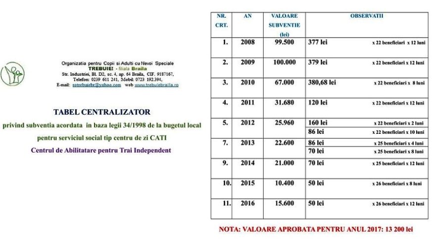 Potrivit datelor prezentate de Teodora Ilie, evolutia subventiilor primite de “Trebuie!” pentru Centrul de zi “Cati” a fost urmatoarea: * 2008 – 99.500 lei (377 lei/ persoana asistata; suma totala este subventia pentru 22 beneficiari, timp de 12 luni); * 2009 – 100.000 lei (379 lei/persoana asistata; suma totala este subventia pentru 22 beneficiari, timp de 12 luni); * 2010 – 67.000 lei (380,68 lei/persoana asistata; 22 beneficiari, 8 luni); * 2011 – 31.680 lei (120 lei/persoana asistata; 22 beneficiari, 12 luni); * 2012 – 25.960 lei (160 lei/persoana asistata, pentru 22 beneficiari, timp de 2 luni; 86 lei/persoana asistata, pentru 22 beneficiari, timp de 10 luni) * 2013 – 22.600 lei (86 lei/persoana asistata, pentru 25 de beneficiari, timp de 4 luni; 70 lei/persoana asistata, pentru 25 de beneficiari, timp de 8 luni); * 2014 – 21.000 lei (70 lei/persoana asistata; 25 beneficiari, 12 luni); * 2015 – 10.400 lei (50 lei/persoana asistata; 26 beneficiari, 8 luni); * 2016 – 15.600 lei (50 lei/persoana asistata; 26 beneficiari, 12 luni).